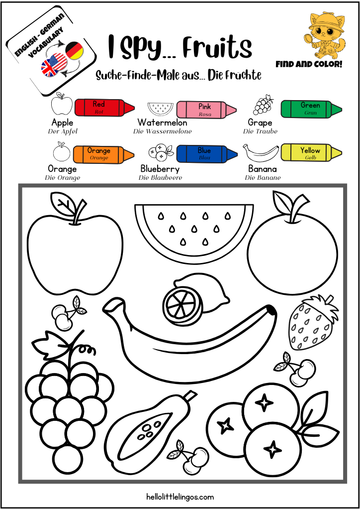 I Spy FRUITS Free printable worksheets for kids in English and German / “Ich sehe was, was du nicht siehst – DIE FRÜCHTE” kostenlose Arbeitsblätter für Kinder auf Englisch und Deutsch
